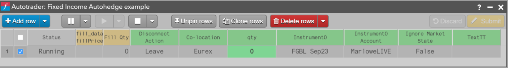 ADL アルゴが一度展開されると、TT プラットフォーム内で利用可能になります。TT の Autotrader ウィジェットを使って、アルゴを選択し、「+ 行の追加」ボタンをクリックしてインスタンスをステージ化します。