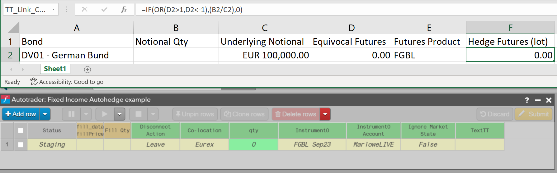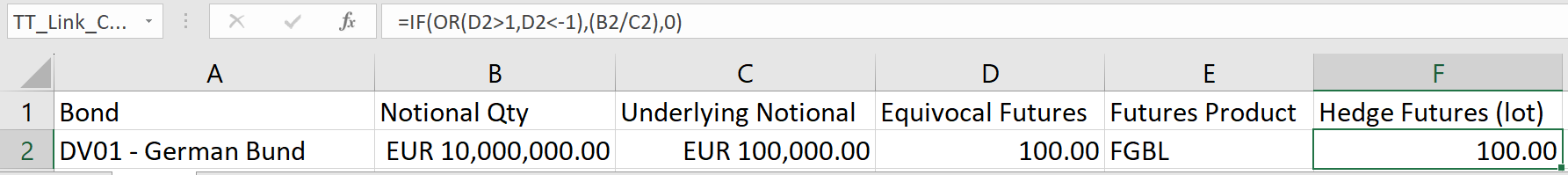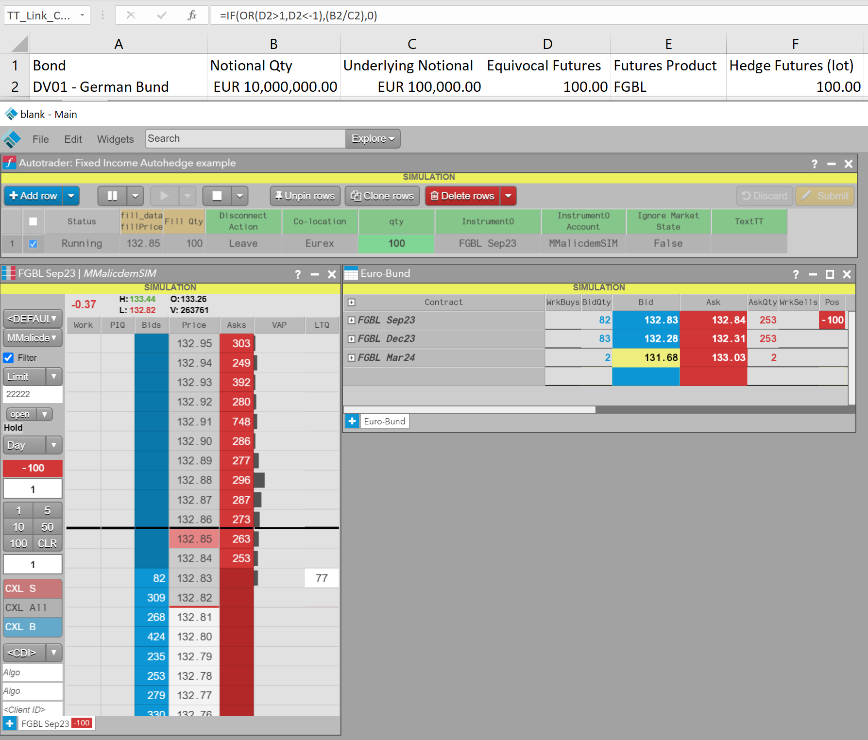 ファンド マネージャーからの上記の要件に従って、彼は10年物ドイツ国債 (Bund) のロング1,000万ユーロ想定元本の両建て取引を確認します。この 1,000 万ユーロの値はセル B2 に伝搬され、下流でオートヘッジ売注文が、同等の FGBL Sep23 先物限月で、成行で執行されます。
