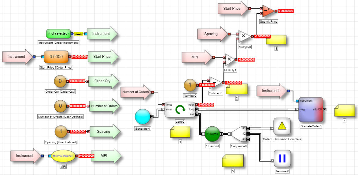- 各ループ時に、Discrete Order ブロック (DOB) は「Submit Price」 と 「Order Qty」と表示されたブロックを参照します。Loop ブロックは、次のループを開始する前に離散メッセージが DOB に到達するまで待機します。これで確実に各注文が新規の価格帯で送信されるようにします。