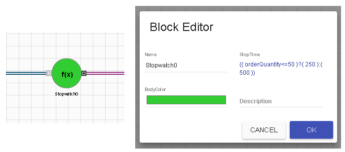 Stopwatch ブロックではユーザーが、ミリ秒で離散イベントの時間の遅延を設定できます。ミリ秒数は関連の緑色のキャンバスの出力として指定されるので、内部のロジカル状態に基づいて異なります。