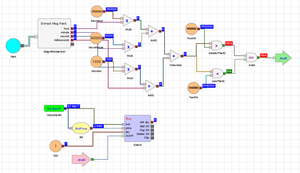 これが便利である場合の例として、特定の時間に Order ブロックのオン・オフ入力ポートを更新することです。以下のアルゴにて、Order ブロックが 3:00:00.000 (米国中央時間帯) に有効化されます。