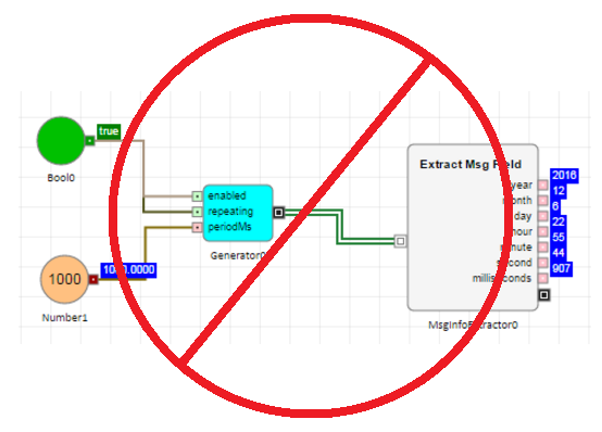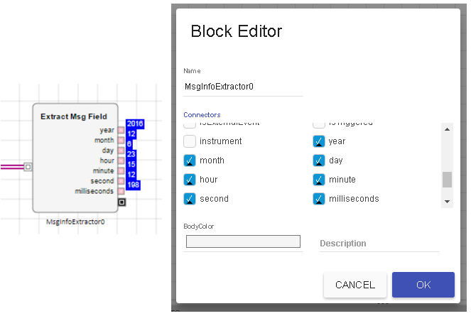 新規の MsgInfo Extractor ブロックを使って、イベントが発生した日付と時間を露出することができます。特に言えば、年、月、日、時間、分、秒、ミリ秒の出力ポートを露出します。これらは離散イベントが MsgInfo Extractor ブロックに入ると常に更新されます。日付と時間のスタンプは、ブロックがメッセージを受信する時間の一点を示しています。