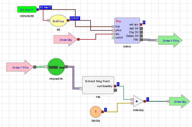 これが便利である場合の例として、約定と追加の注文発注の間での遅延を設定することです。以下のアルゴでは、Order ブロックにフィードされる枚数が増加する前に、約定メッセージでは10秒間の遅延があります。