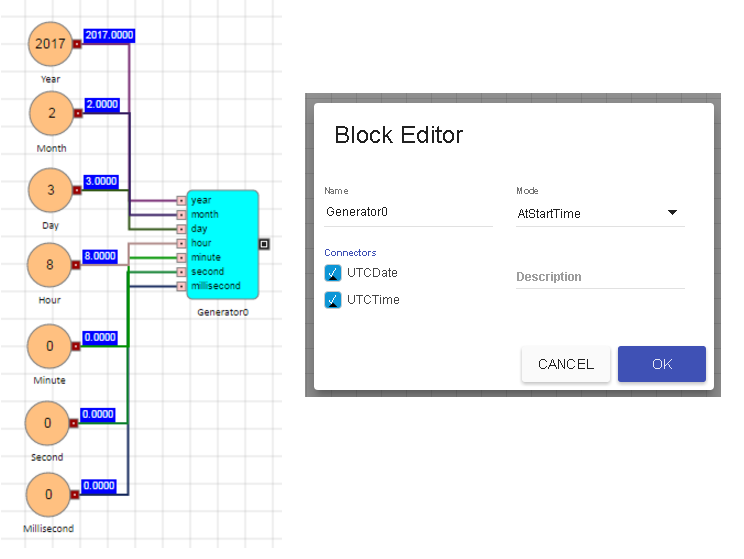 Generator ブロックの新規の AtStartTime モードを使って、通知のメッセージを送る日付と時間を指定できます。AtStartTime モードの際、UTCDate と UTCTime コネクターの両方を表示します。これは年、月、日、時間、秒、ミリ秒で構成されています。指定した UTC 日付と時間に達すると、離散イベントは出力ポートから伝搬されます。