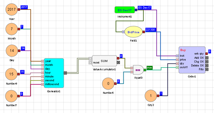 これが便利である場合の例として、特定の日付と時間に Order ブロックのオン・オフ入力ポートを更新することです。以下のアルゴにて、Order ブロックが2017年7月14日 15:00:00.000 (米国中央時間帯) まで有効化されます。