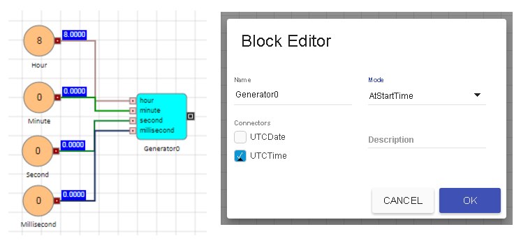 Generator ブロックの新規の AtStartTime モードを使って、通知のメッセージを送る毎日の時間を指定できます。AtStartTime モードの際、UTCTime コネクターを表示します。これは時間、秒、ミリ秒で構成されています。指定した UTC 時間に達すると、離散イベントは出力ポートから伝搬されます。これは毎日繰り返されます。