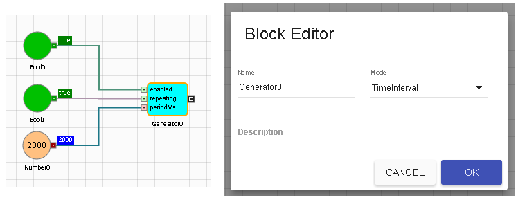 Generator ブロックの機能強化された TimeInterval モードを使って、指定した時間の間隔が経過した際に、離散メッセージ通知を送るように指定できます。このモードにある場合、有効化、繰り返し、periodMs の入力ポートが露出されます。有効化ポートを使って、タイマーを有効化または無効化でき、繰り返しポートを使って、イベントを繰り返すことができ、さらに periodMs ポートを使って、時間の期間をミリ秒で定義できます。これらのすべてを動的に設定できます。