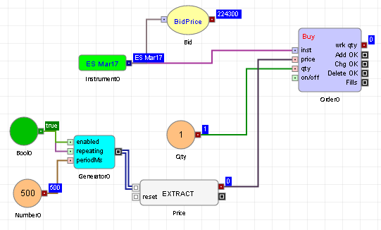 これが便利である場合の例として、特定の時間の間隔で Order ブロックの価格ポートを更新することです。以下のアルゴで、注文が 500ミリ秒毎に買値と同じ値に再価格設定されます。