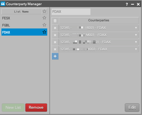 The Counterparty Manager widget simplifies your Eurex Enlight request-for-quotes (RFQs) workflow by allowing you to aggregate counterparties into lists. When submitting the RFQ, you can save time by sending the RFQ to a pre-configured list of counterparties instead of selecting them one at a time.