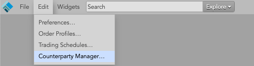 To open the Counterparty Manager, click Edit in the workspace title bar and select Options then RFQ with Counterparties from the widgets menu.