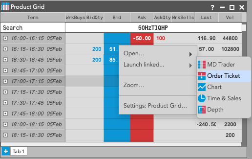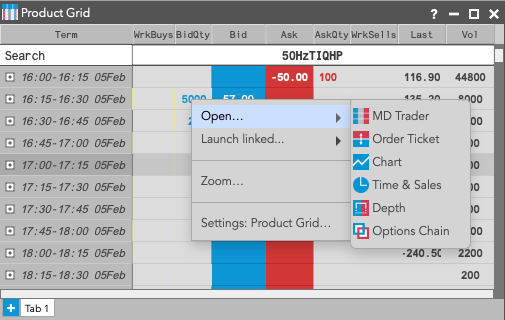 Right-click on an instrument row and select Open to show a list of widgets that can be opened from the Product Grid.