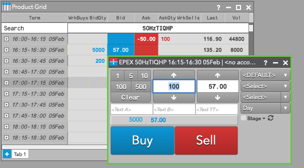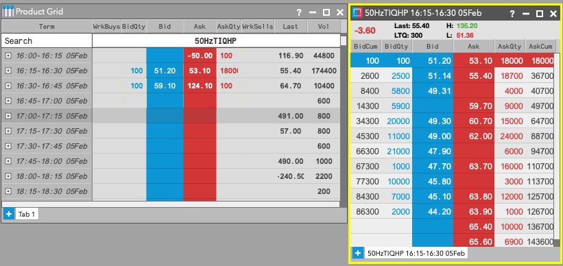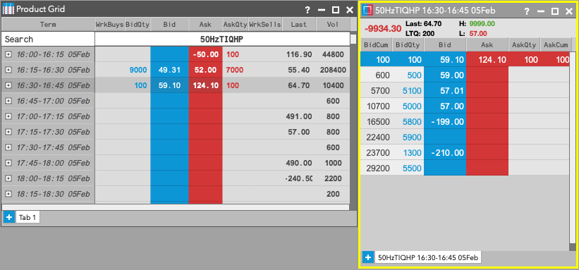 A stand-alone widget is populated with market data for an instrument selected in the Product Grid.