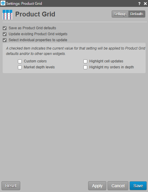These settings affect only the selected Product Grid widget. To update the default settings with these values for newly-opened Product Grid widgets, or to apply them to existing opened widgets, click Defaults.