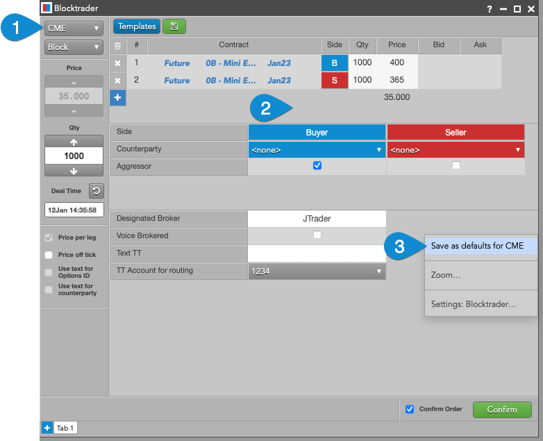 既定値を置き換えるには、取引所に対し新規の値で Blocktrader を生成し、[Save as defaults for <market name>] を選択します。