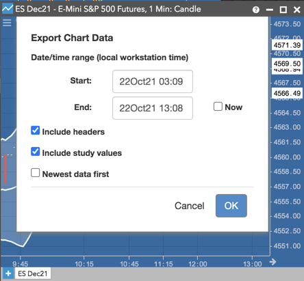 - Include study values: チャートに追加されたテクニカル指標のデータをエクスポートします。
