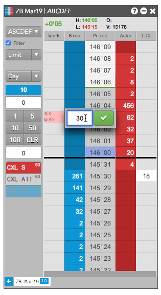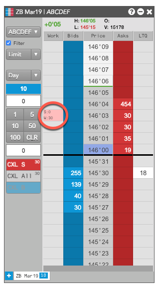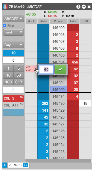 - 1つ以上の約定待ち注文がある価格帯の約定待ちセルを右クリックします。その価格帯の注文の現在の合計約定枚数を示す入力ボックスが表示されます。