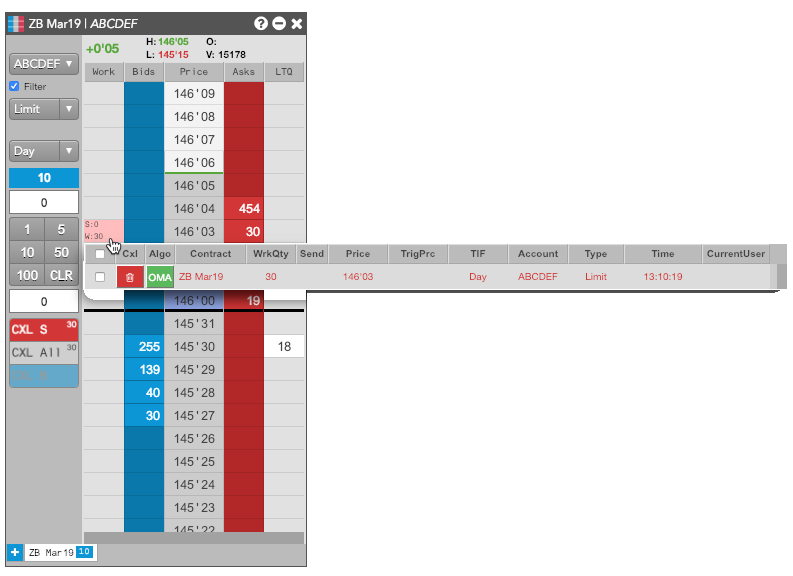 - 特定の価格帯で注文を取り消すには、希望の価格帯の [Work] 列でセルの約定待ち注文をクリックします。この操作で、その価格帯のすべての注文を取り消しできます。