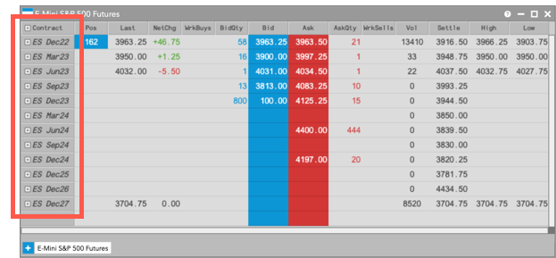 特定の銘柄に対して、すべての利用可能な限月を含んだタブを作成できます。この方法で、期限切れの限月は自動的に次の限月にロールされ、新しい限月が利用可能になると、自動的にタブに追加されます。