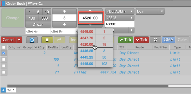 [Floating Depth] (簡易板情報) ポップアップ ウィジェットを使って、限月の板情報からすばやく発注できます。[Market Grid] (銘柄情報) と [Spread Matrix] (スプレッド価格表) の価格や枚数の上を、また [Order Book] (注文一覧) や [Order Ticket] (注文チケット) で価格や枚数の編集コントロールをマウスでポイントすると、ウィジェットが表示されます。