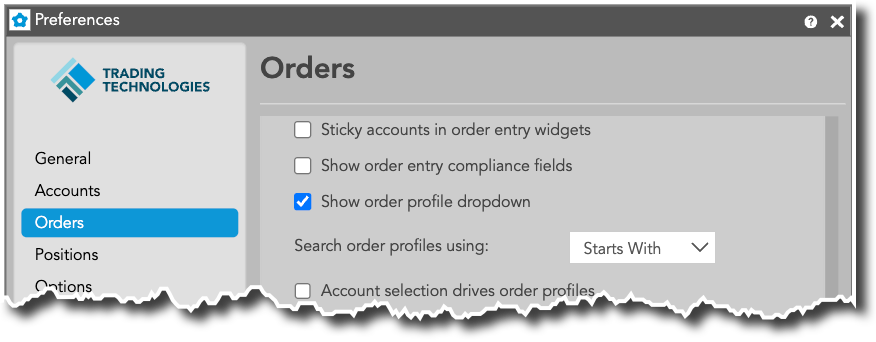 注文プロファイルは、発注時に選択する口座に基づいて選択できます。口座ごとにプロフィルを選択するには、[Preferences] (設定) → [Orders] (注文) で [Account selection drives order profiles] オプションを有効化します。