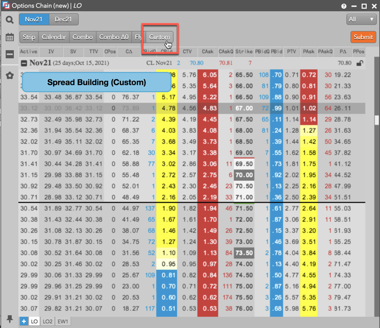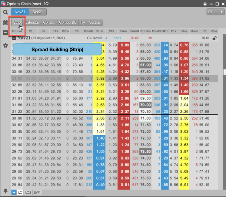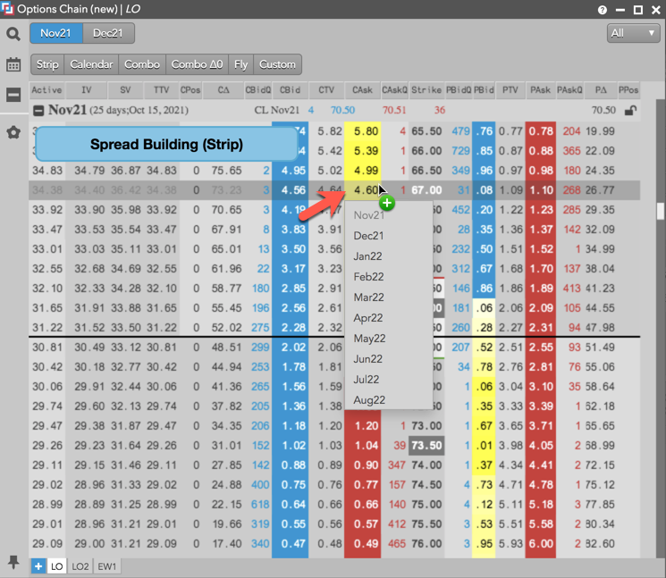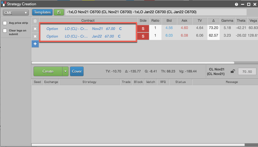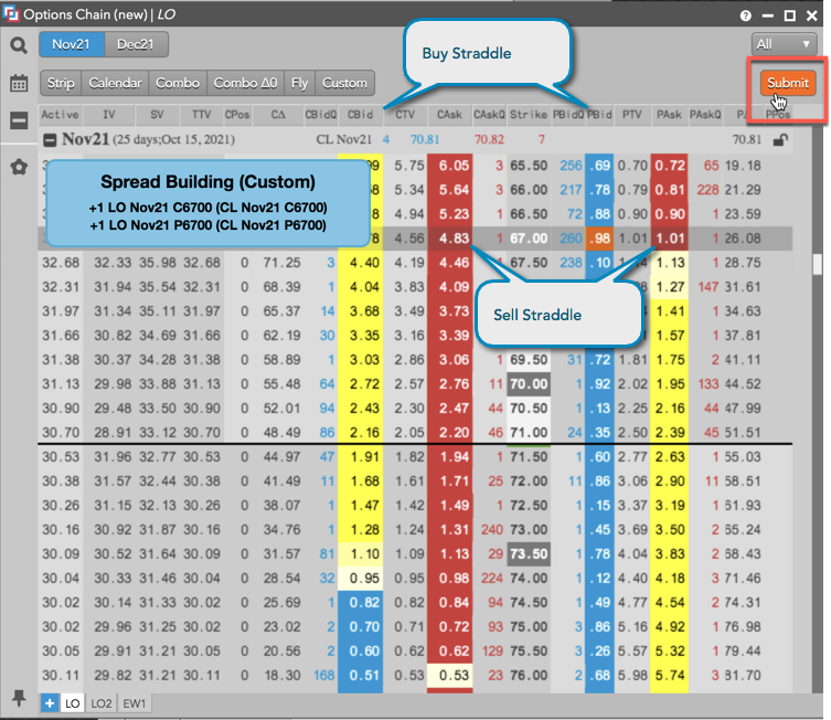 この例では、CL Nov21 の現物先物限月にたいし、67.00 ストライク値で買または売のストラドル オプション ストラテジーを作成する方法を示しています。
