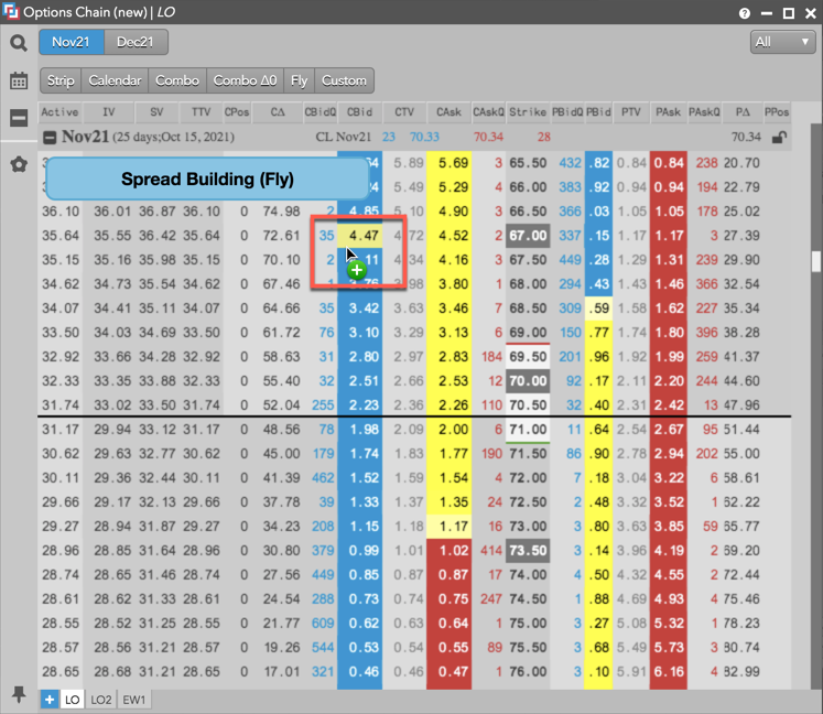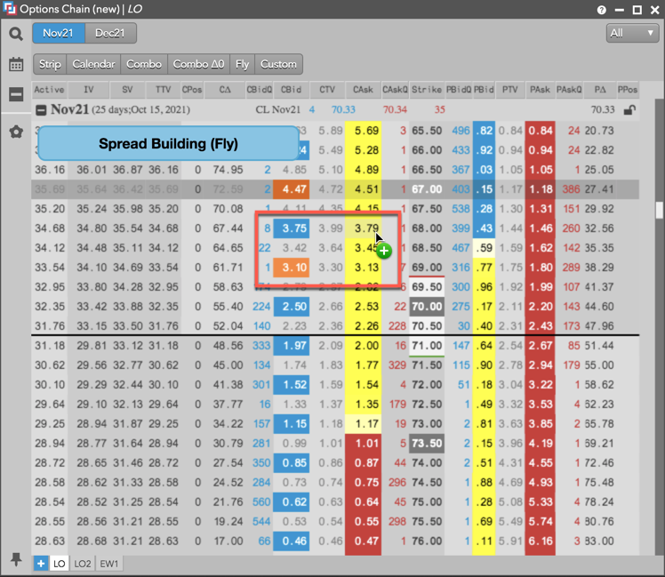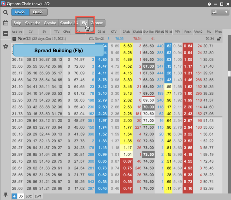 [Options Chain] ウィジェットにて、[Fly] をクリックして [Spread Building] (スプレッド作成) モードに入ります。