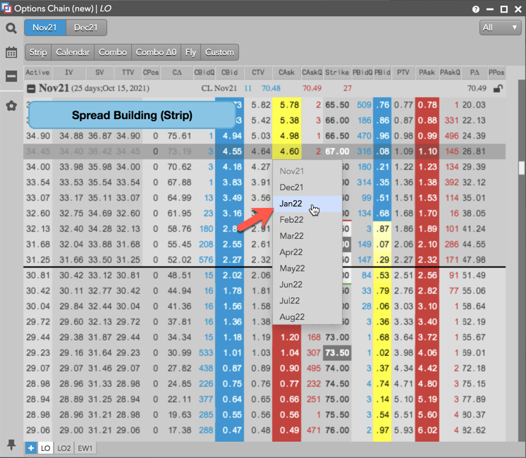 以下の例は、2021年11月から2022年1月の各満期月の1つのコール オプション限月を売る、ストリップ スプレッドを作成する方法を示しています。