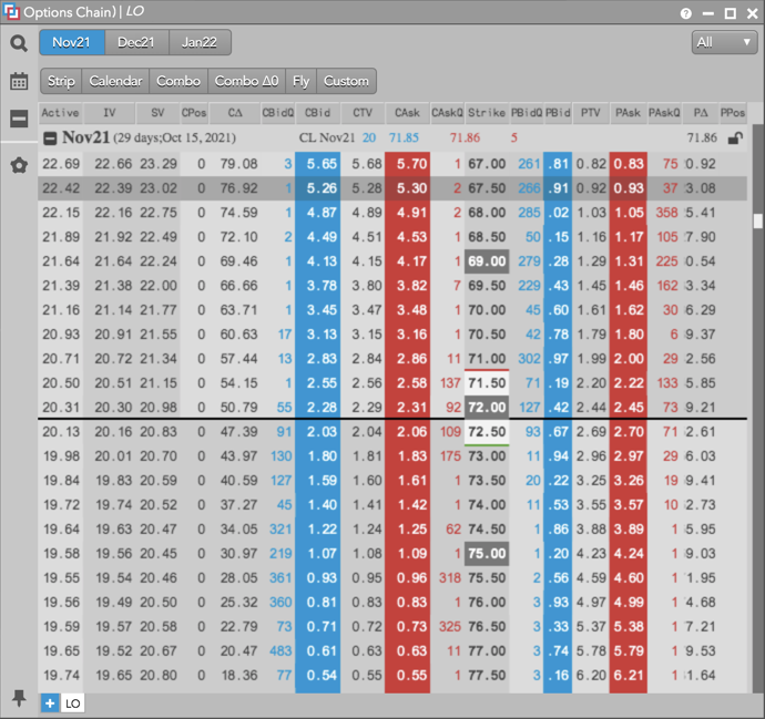 [Options Chain] では、中央列にストライク値が表示され、それぞれ左列と右列にコールとプットのプレミアム値が表示されます。