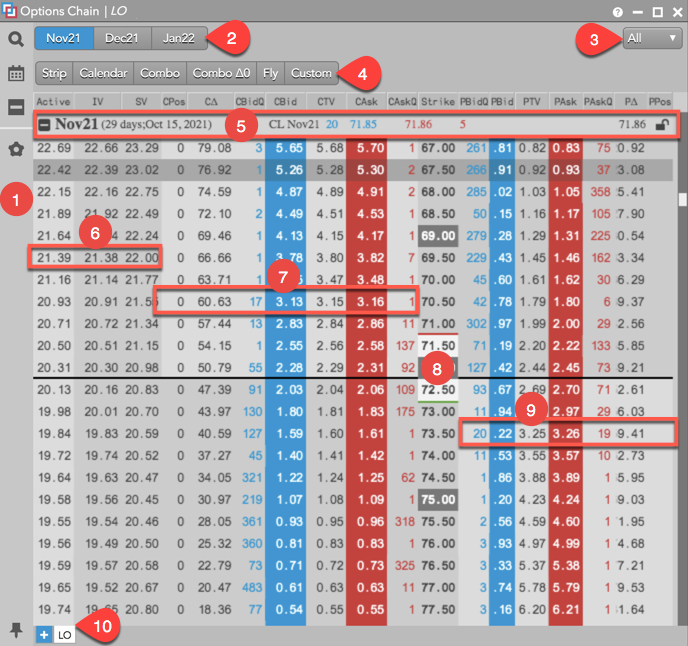 - Expiry buttons and term panel: [Option Chain] に選択した期日。期日が選択されると、期間パネルにボタンとして表示されます。期日ボタンをクリックして、その期日のアットザマネー ストライクに移動します。