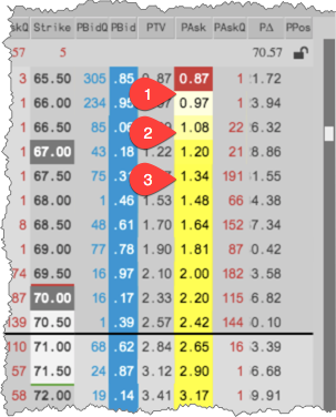 オプション チェーン設定の配色を使って、理論値と市場の間の関係に基づいて、今後の発注の機会を強調表示することもできます。[Option Chain] にて、理論値がティック数分市場に近づいた際、買値と売値が強調表示されます。価格は黄色の網掛け表示され、理論値が市場にどのくらい近づいたかを示しています。