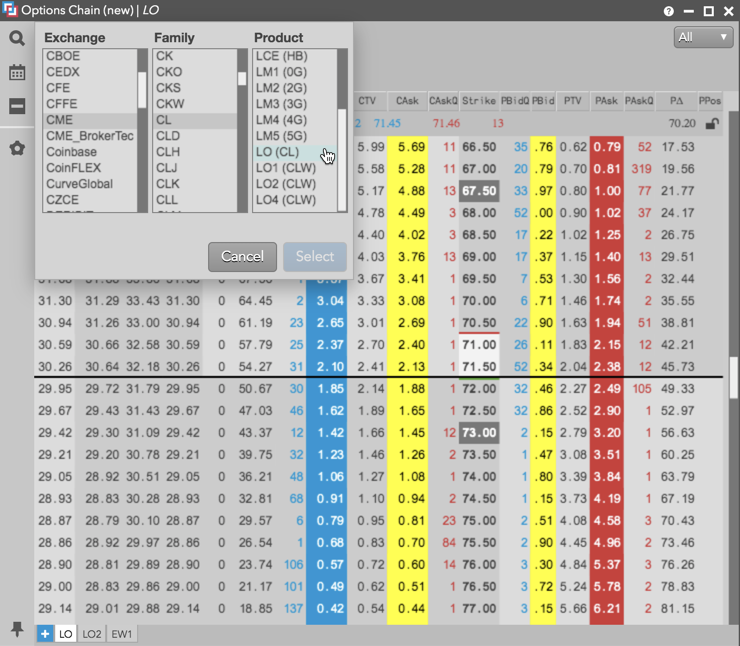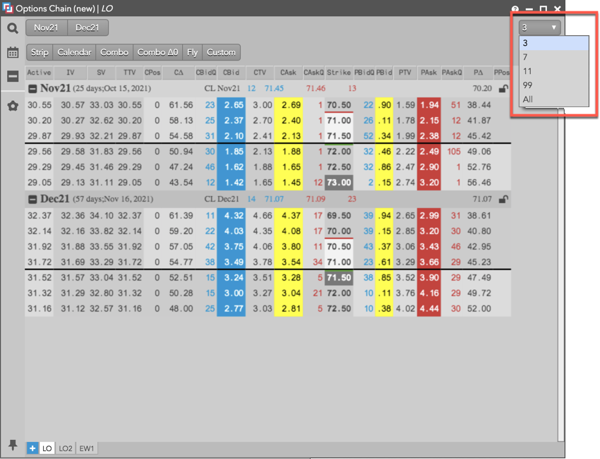 全ての期日の現在のストライク値の上と下に表示するストライク数を定義するには、クイック ストライク フィルターをクリックして価格帯の数を選択します (例:3価格帯)。