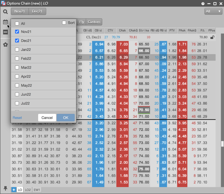 ] を有効にして銘柄のすべての期日を表示します。ウィジェットの上部の期間パネルに期日が表示されます。