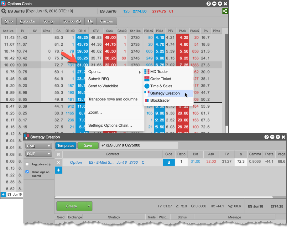 [Options Chain] ではまた、個々のオプション限月を [Strategy Creation] ウィジェットに送信し、ストラテジーの作成を促進することができます。コール オプションやプット オプション限月に固有のデータを右クリックし、[Open] → [Strategy Creation] を選択すると、選択した限月の値が入力されたウィジェットが起動されます。