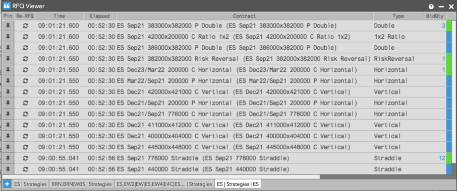 注: [RFQ Viwer] で開いた銘柄の RFQ のみが表示されます (オプション ストラテジー等)。タブごとに複数の銘柄や銘柄ファミリーを起動できます。