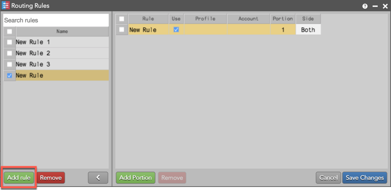 [Routing Rules] ウィジェットを使って、最も一般的な注文送信の状況で注文が送信される方法を定義できます。ルールが作成されて認証され、有効化されると、注文発注の際に適用できます。