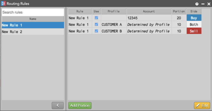 [Routing Rules] ウィジェットは、ブローカーや顧客ごとに、最も一般的な送信の場面を設定できる機能を提供しています。ウィジェットを使って、ルーティング ルールを作成し、異なったブローカーや口座の間で、異なった注文部分を分割して送信できます。