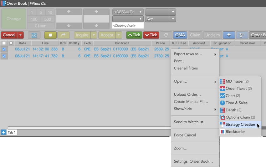 オプション限月や先物限月の注文行や約定行を1つ以上右クリックして、コンテキスト メニューから [Open] → [Strategy Creation] を選択します。