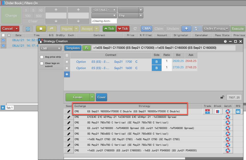 [Create] または [Create & Watch] をクリックすると、ユーザー定義のストラテジーが取引所に送信されます。これが認証されると、取引所は取引セッションの取引所取引銘柄として、ストラテジーをパブリッシュします。