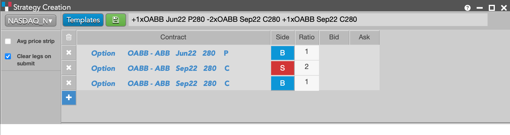 ユーザー定義コンビネーションは、オプションを含むストラテジーに対し、最小 2 レッグ、最大10 レッグで作成でき、または先物を含むストラテジーに対し2レッグで作成できます。[ストラテジー作成] ウィジェットにて、各レッグの限月、レシオ、売買側を入力します。
