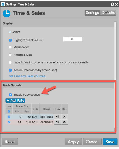 [Trade Sounds] (取引サウンド) セクションを使って、ユーザー定義の枚数範囲を満たしている場合または超過した場合にサウンドを再生できます。この機能を有効化するには、[Enable trade sounds ] チェックボックスをオンにします。
