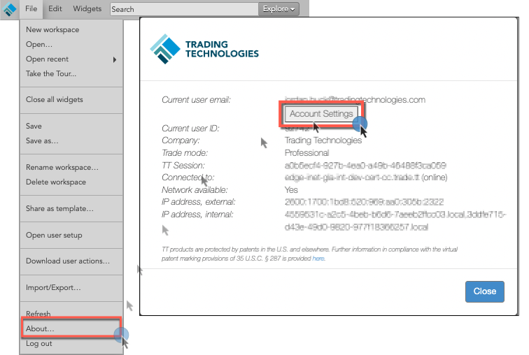 またワークスペース内からも TT 口座設定にアクセスできます。[ファイル] の [メニュー バー] にて、スクロールして [About...] (製品情報) をクリックします。[About] 画面が開き、[口座設定] をクリックできます。