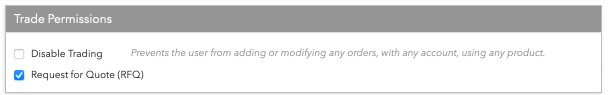 Setup の [Permissions] タブにて、[Request for Quote (RFQ)] を有効にして、RFQ 機能を有効化し、[Disable Trading] (取引の無効化) 設定がオフになっていることを確認します。