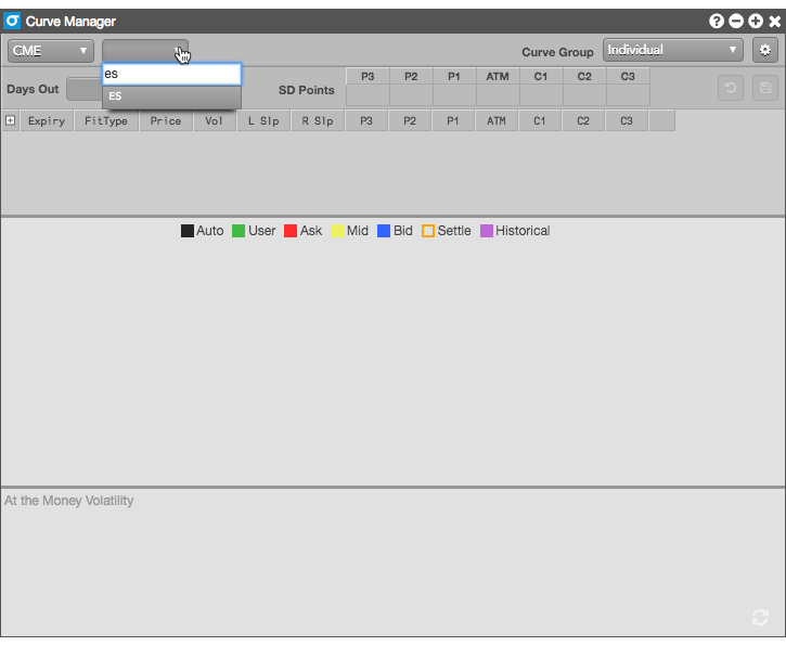[Vol Curve Manager] の2つのドロップダウン欄で、目的の取引所とオプション銘柄をそれぞれ選択します。現時点では、ボラティリティ カーブはすべての取引所と銘柄でサポートされているわけではありません。