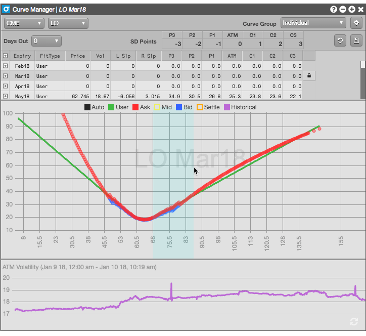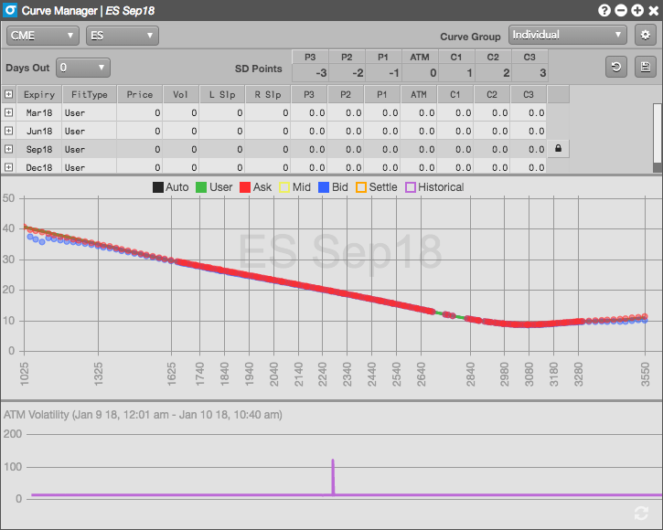 オプションの満期日の行の任意の地点をクリックすると、そのボラティリティ カーブが表示されます。