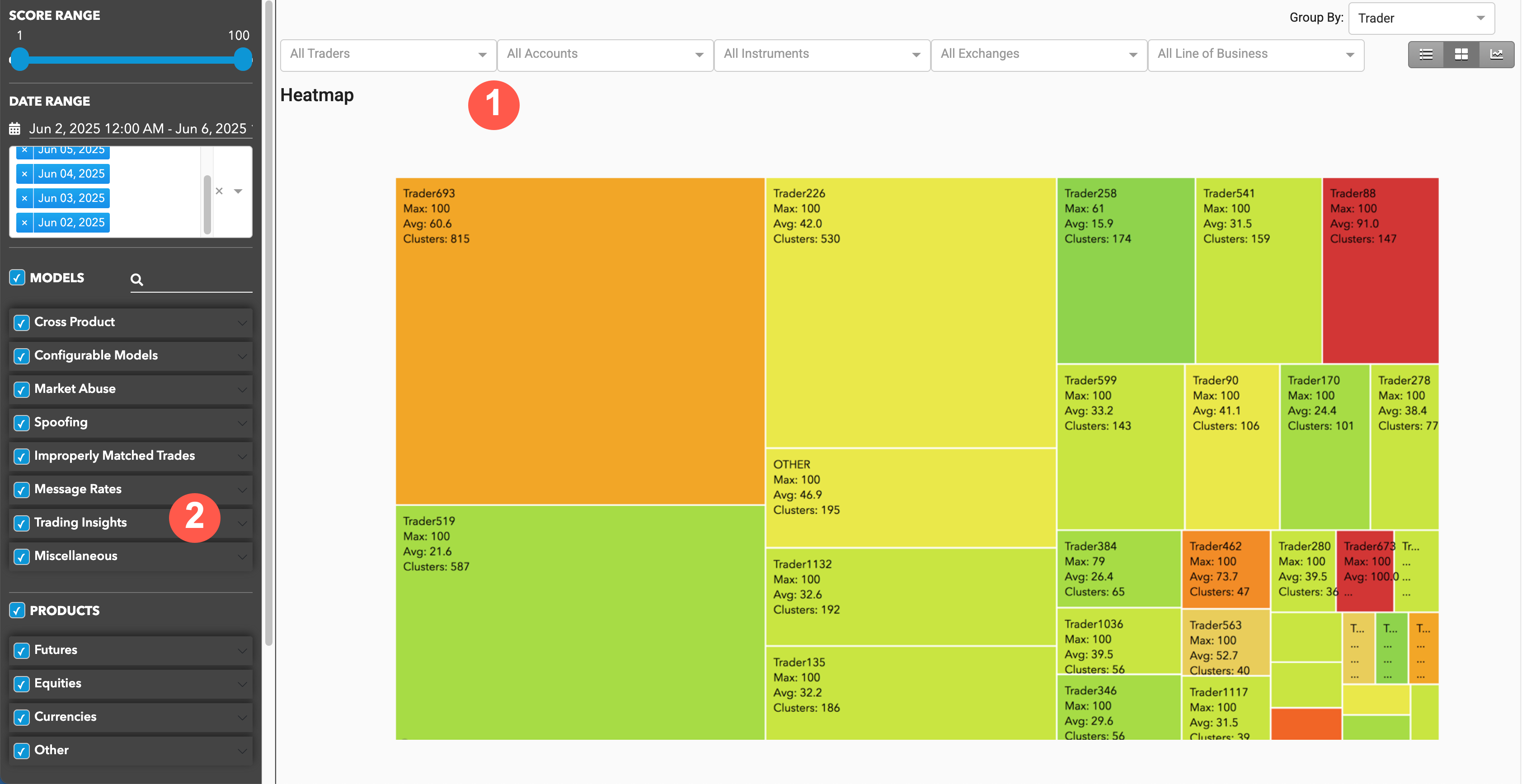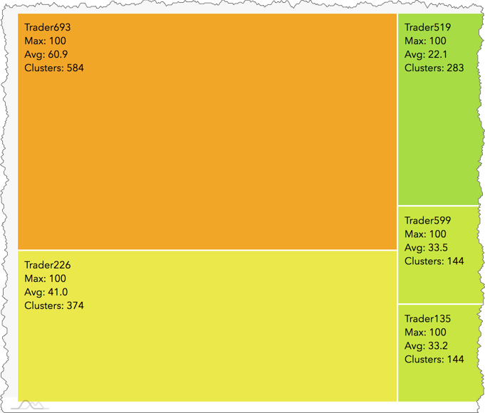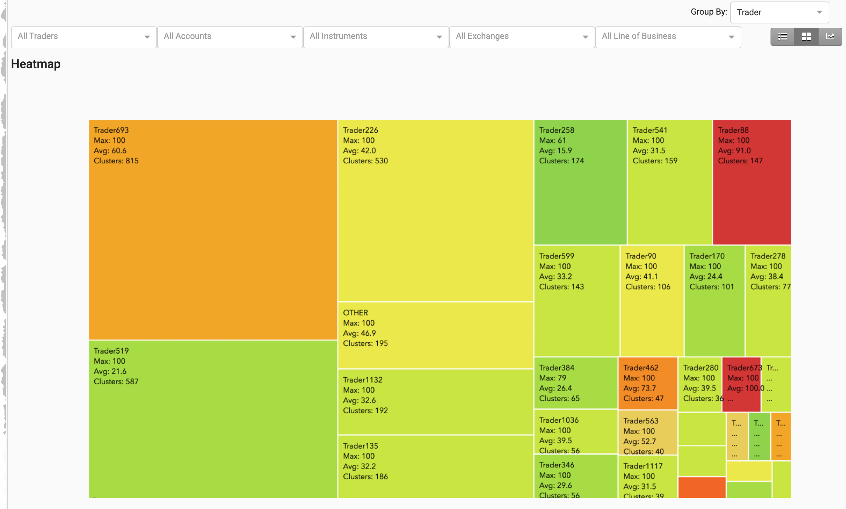 The Heatmap groups clusters by trader, instrument, or account, and displays these groups as a collection of blocks. TT Score calculates an average risk score for each block based on the clusters in the group represented by that block.