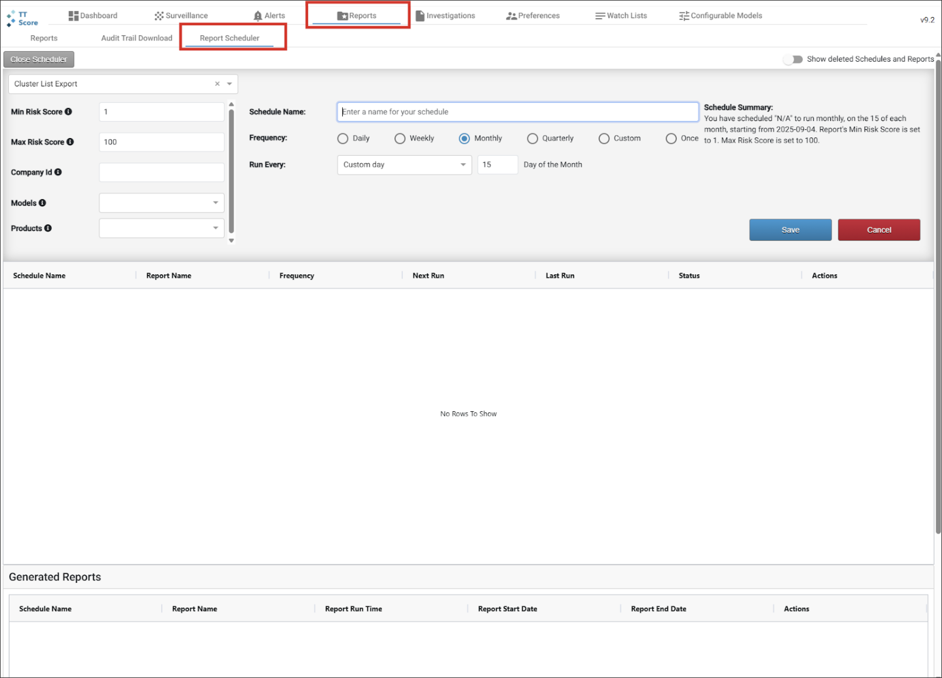 - On the Trade Surveillance dashboard, select the Reports tab and click Report Scheduler.