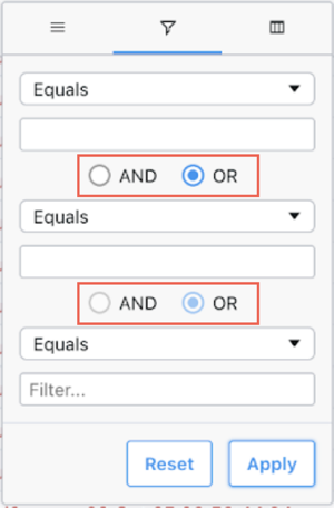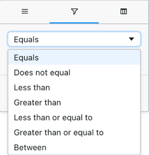 ) icon will appear beside the column name.DataLens provides multiple types of filters. The selected column filter determines which operators are available in the drop-down.