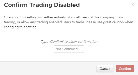CAUTION: Selecting the Disable Trading setting entirely blocks all users in all environments from trading. Please use great caution when selecting this setting.