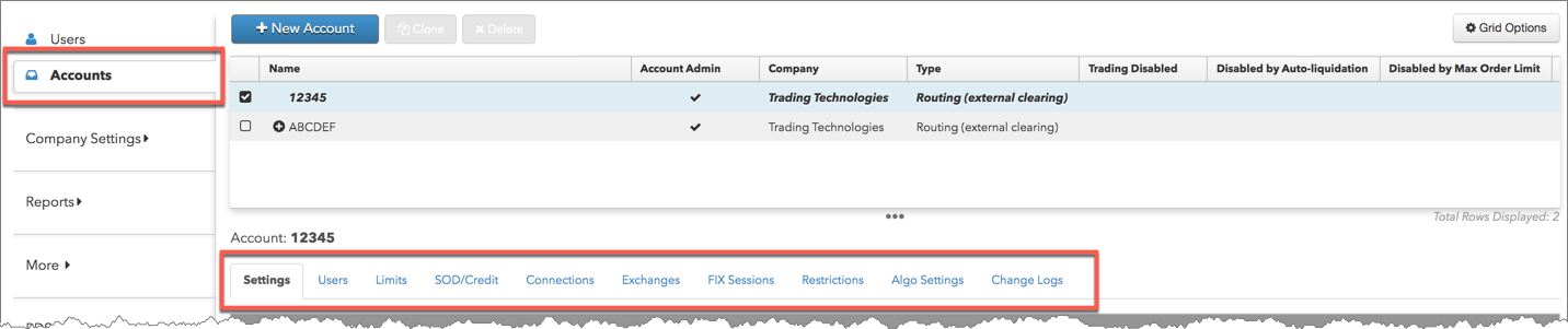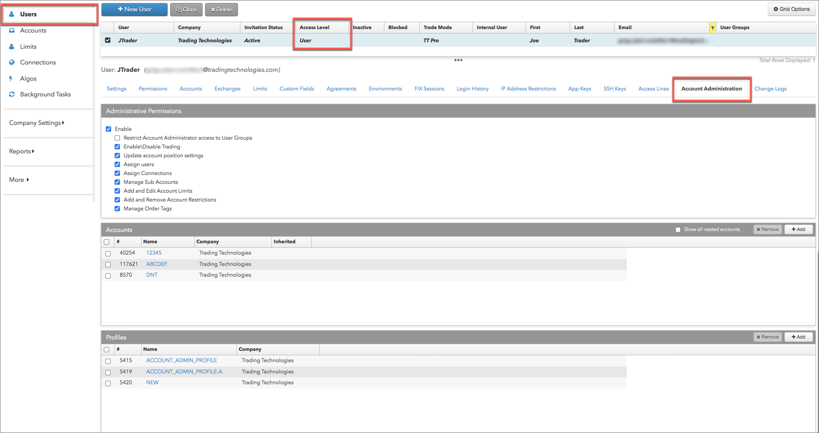 [Users] → [Account Administration] タブにて、選択したユーザーの口座の管理者アクセス許可を設定して口座を割り当てることができます。
