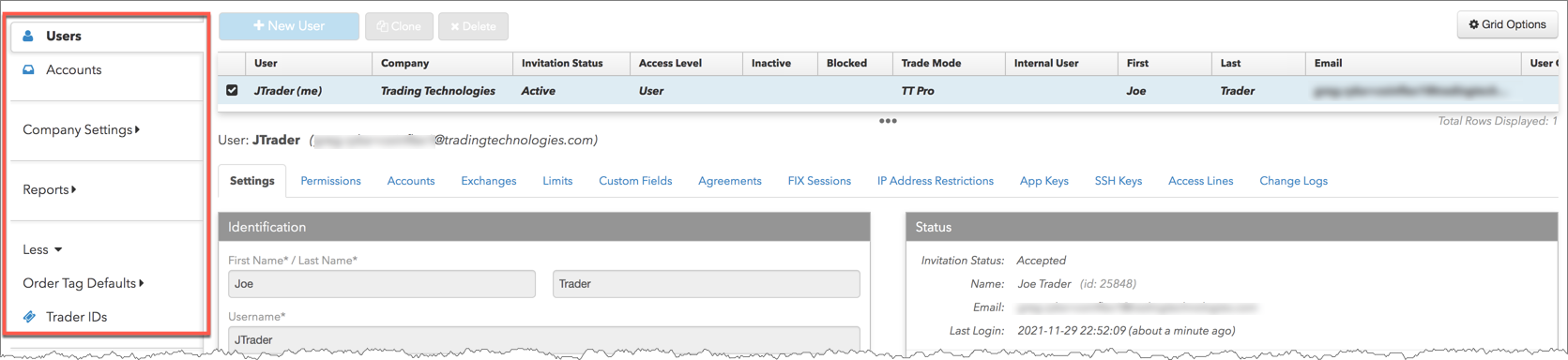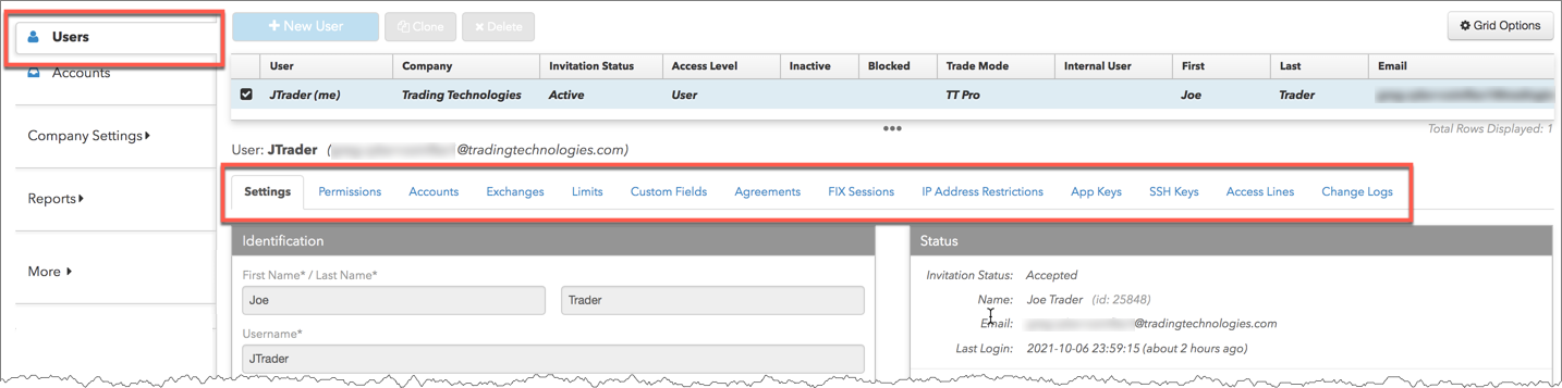 [Users] → [Accounts] タブにて、ユーザー名を割り当てできますが、会社の管理者として管理している口座のみ追加できます。[Users] → [App Keys] タブで各自のアプリケーション キーを作成することもできます。